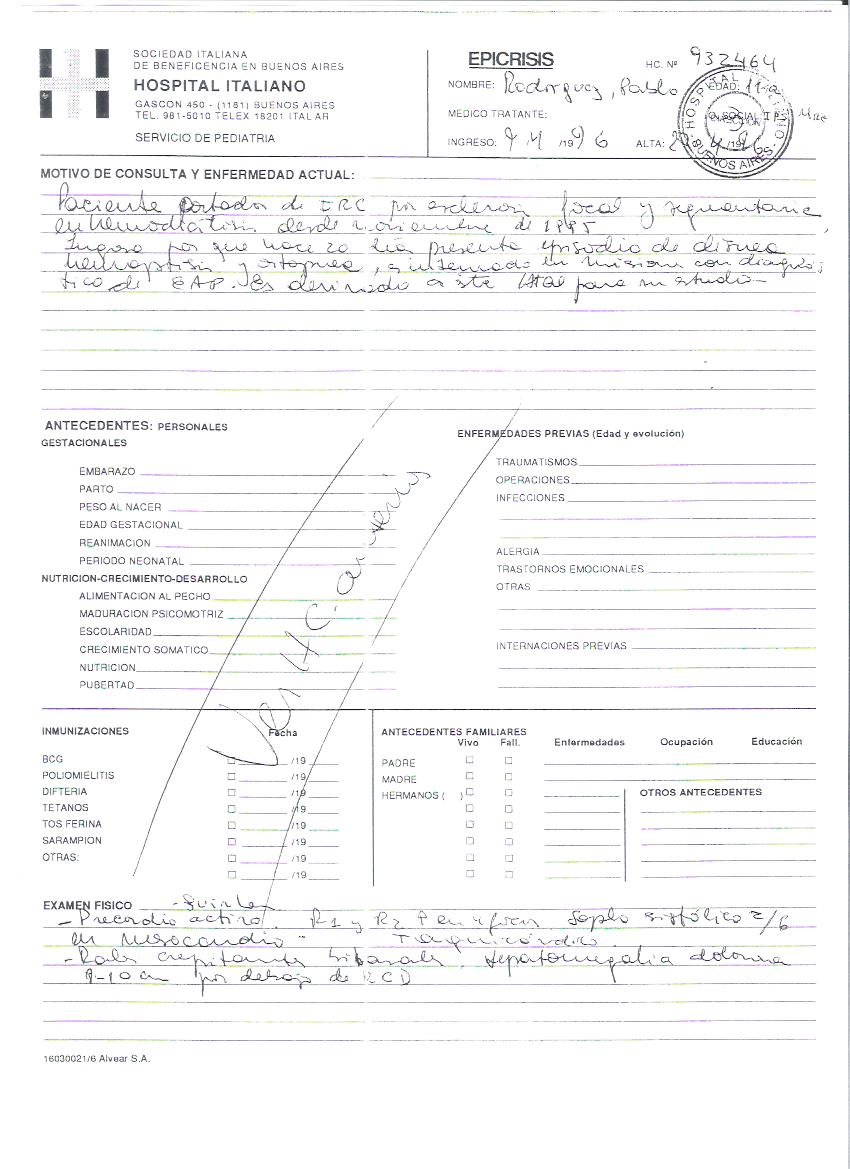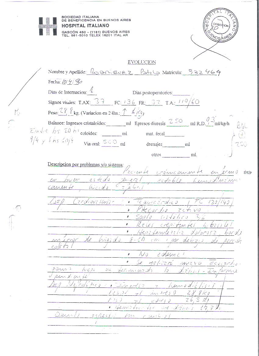Historia Clínica en el Hospital Italiano desde su ingreso el 9 de abril de 1996.