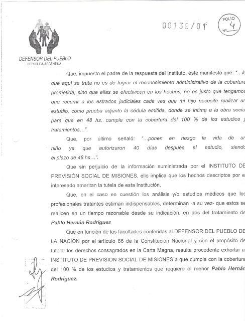 Que en función de las facultades conferidas al DEFENSOR DEL PUEBLO DE LA NACIÓN por el artículo 86 de la Constitución Nacional y con el propósito de tutelar los derechos consagrados en la Carta Magna, resulta procedente exhortar al INSTITUTO DE PREVISIÓN SOCIAL DE MISIONES a que cumpla con la cobertura del 100% de los estudios y tratamientos que requiere el menor Pablo Hernán Rodriguez.