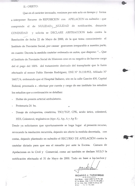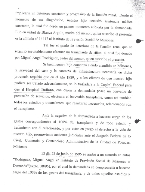 «Tal como lo expresáramos anteriormente, la negativa del Instituto de Previsión Social de la Provincia de Misiones a hacerse cargo de los gasto que implican los monitoreos posteriores al trasplante de riñón al que fuera sometido nuestro hijo los cuales resultan indispensables a fin de establecer en forma inmediata cualquier rechazo del organismo de nuestro hijo del riñón trasplantado, pone en grave peligro la vida de nuestro hijo»