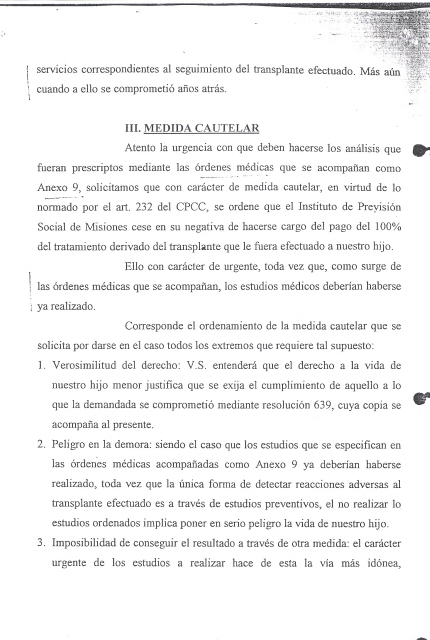 «Atento la urgencia con que deben hacerse los análisis que fueron prescripto mediante las ordenes medicas que se acompañan, como anexo 9, solicitamos con carácter de medida cautelar, en virtud de lo normado Art. 232 del CPCC, se ordene que el Instituto de Previsión Social de Misiones cesé en su negativa de hacerse cargo del pago del 100 %, del tratamiento derivado del trasplante que le fuera efectuado a nuestro hijo..»