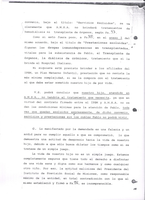 La vida de nuestro hijo no es un simple juego. Estamos completamente seguros que tiene todo el derecho a disfrutar de una vida sana y digna como sus hermanos y como cualquier otro niño. Por eso, la actitud maliciosa del Presidente del Instituto de Previsión Social de Misiones, como responsable máximo de la entidad, en total contradicción con lo que el mismo estableció y firmo a fs. 152, es incompresible. Por lo expuesto y dado que el Hospital Italiano si le brinda, Drogas inmunosupresoras, tratamientos de diálisis para enfermos crónicos, tratamientos odontológicos para trasplantados y cuenta con la posibilidad de realizar trasplante de órganos, dicho nosocomios es el lugar idóneo donde se le asegura, a Pablo, su posibilidad de continuar viviendo. Por lo que si el IPSM, continua con su actuar caprichoso de cambiar la institución en donde se atiende Pablo, será el Instituto de Previsión Social de Misiones el único y exclusivo responsable de lo que a nuestro hijo le pudiera pasar.