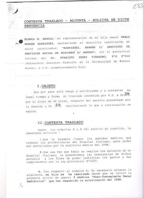 Blanca N. Argolo, en representación de nuestro hijo menor PABLO HERNÁN RODRIGUEZ, manteniendo el domicilio constituido en autos caratulados: RODRIGUEZ HERNÁN c/ INSTITUTO DE PREVISION SOCIAL DE MISIONES s /AMPARO”, (con el patrocinio letrado del Dr. EVARISTO PEREZ VIRASORO, Tº Fº 512 (Patrocinio Jurídico Gratuito de la Universidad de Buenos Aires) a V.S. respetuosamente digo: