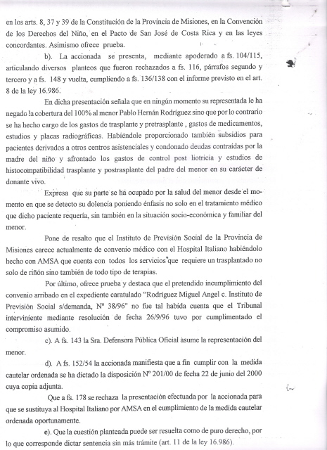 Fundan su presentación en los arts. 16.33 y 34 de la Constitución Nacional en los arts. 8,37 y39 de la Constitución de la Provincia de Misiones, en la Convención de los Derecho del Niño, en el Pacto de San José de Costa Rica y en las leyes concordantes, Asimismo ofrece pruebas. La accionada se presenta, mediante apoderados a fs, 104/115 articulando diversos planteos que fueron rechazados a fs. 116, párrafos segundos y terceros ya fs. 148 y vuelta, cumpliendo a fs. 136/138 con el informe previsto en el art. 8 de la ley 16.986.En dicha presentación señala que en ningún momento su representada la ha negado la cobertura del 100 % al menor Pablo Hernán Rodriguez sino por el contrario se ha hecho cargo de los gastos de trasplante y pre trasplante, gasto de medicamento estudios y placas radiográficas, Habiéndole proporcionado también subsidios para pacientes derivados a otros centros asistenciales y condonado deuda contraídas por la madre del niño y afrontado los gastos de control post litotricia y estudios de histocompativilidad, trasplante y pos trasplante del padre del menor en su carácter de dónate vivo.