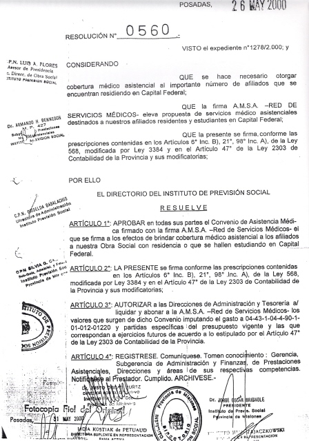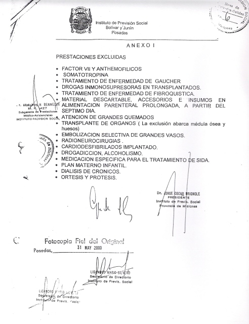 Pone de resalto que el Instituto de Previsión Social de la Provincia de Misiones carece actualmente de convenio medico con el Hospital Italiano habiéndolo hecho con A.M.S.A. que cuenta con todos los servicios que requiere un trasplantado no solo de riñón sino también de todo tipo de terapias.