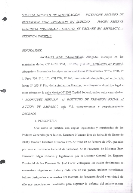 Señor Juez RICARDO JOSE TARNOWSKI Abogado, inscrito en las matriculas de Ley C.P.A.C.F. Tº 54 Fº 829 y el Dr. ERMINDO NAVARRO abogado y procurador inscripto en las matriculas profesionales N º 734, Fº34, Tº1, Proc.730, fº1, L º1, CSJTº84, Fº260 denunciando domicilio real en la calle Junín Nº 295 3ºPiso de la Ciudad de Posadas, constituyendo domicilio legal a estos efectos en la calle México Nº 2009 Capital Federal, en los autos caratulados “RODRIGUEZ HERNAN c/ INSTITUTO DE PREVISION SOCIAL s/ ACCION DE AMPARO” ante V.S. comparecemos y respetuosamente DECIMOS: