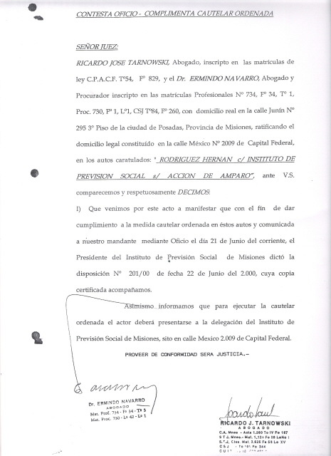 RICARDO JOSE TARNOWSKI, Abogado,…. Y EL DR ERMINDO NAVARRO , Abogado y Procurador…..que venimos por este acto a manifestar que con el fin de dar cumplimiento a la medida cautelar ordenada en estos autos y comunicada a nuestro mandante mediante oficio el día 21 de junio del corriente, el Presidente del Instituto de Previsión Social de Misiones dicto la disposición Nº 201/00 de fecha 22 de junio de 2000, cuya copia certificada acompañamos.