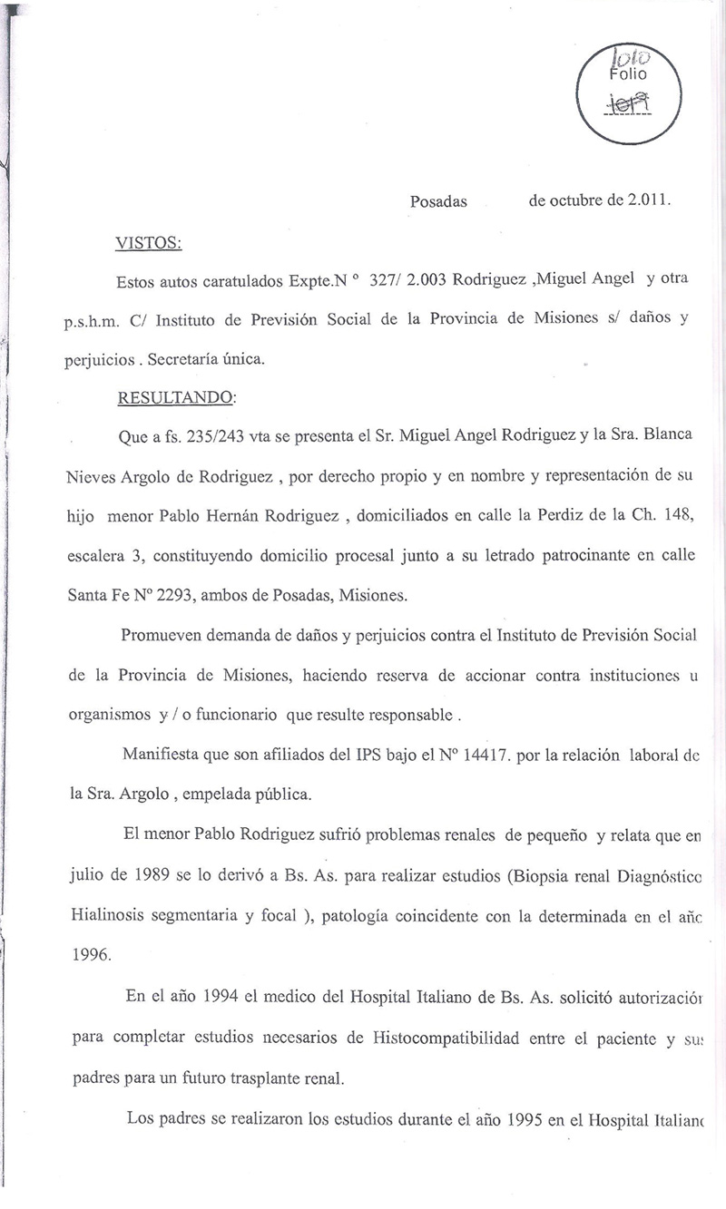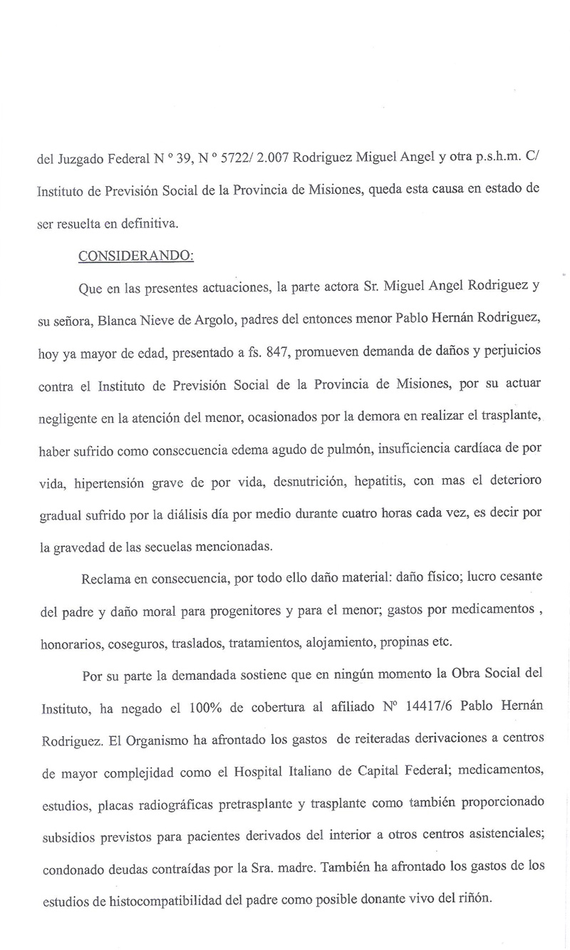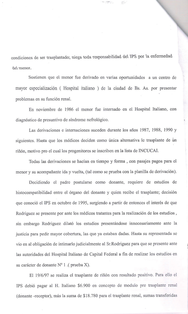 En el año 1996 Instituto de Previsión Social de Misiones (IPSM) prevaleció una situación económica, ante los derechos de un niño, violando la Ley de trasplante.