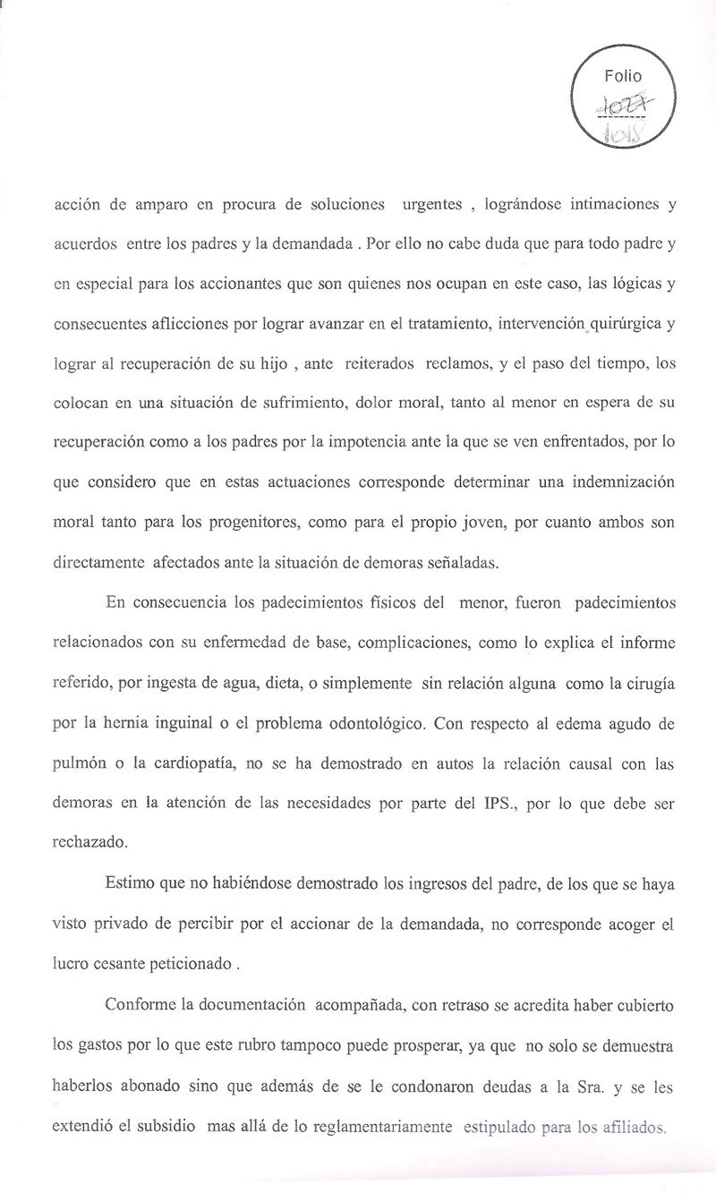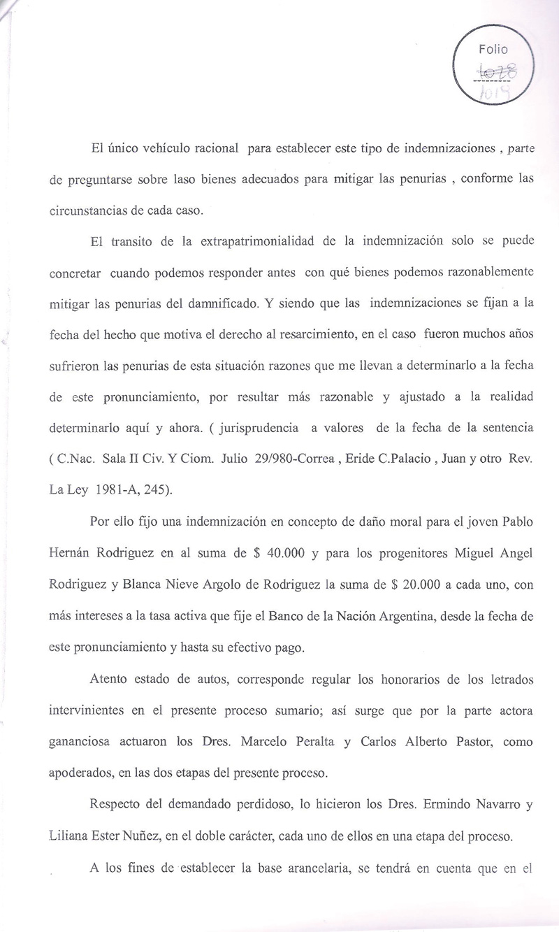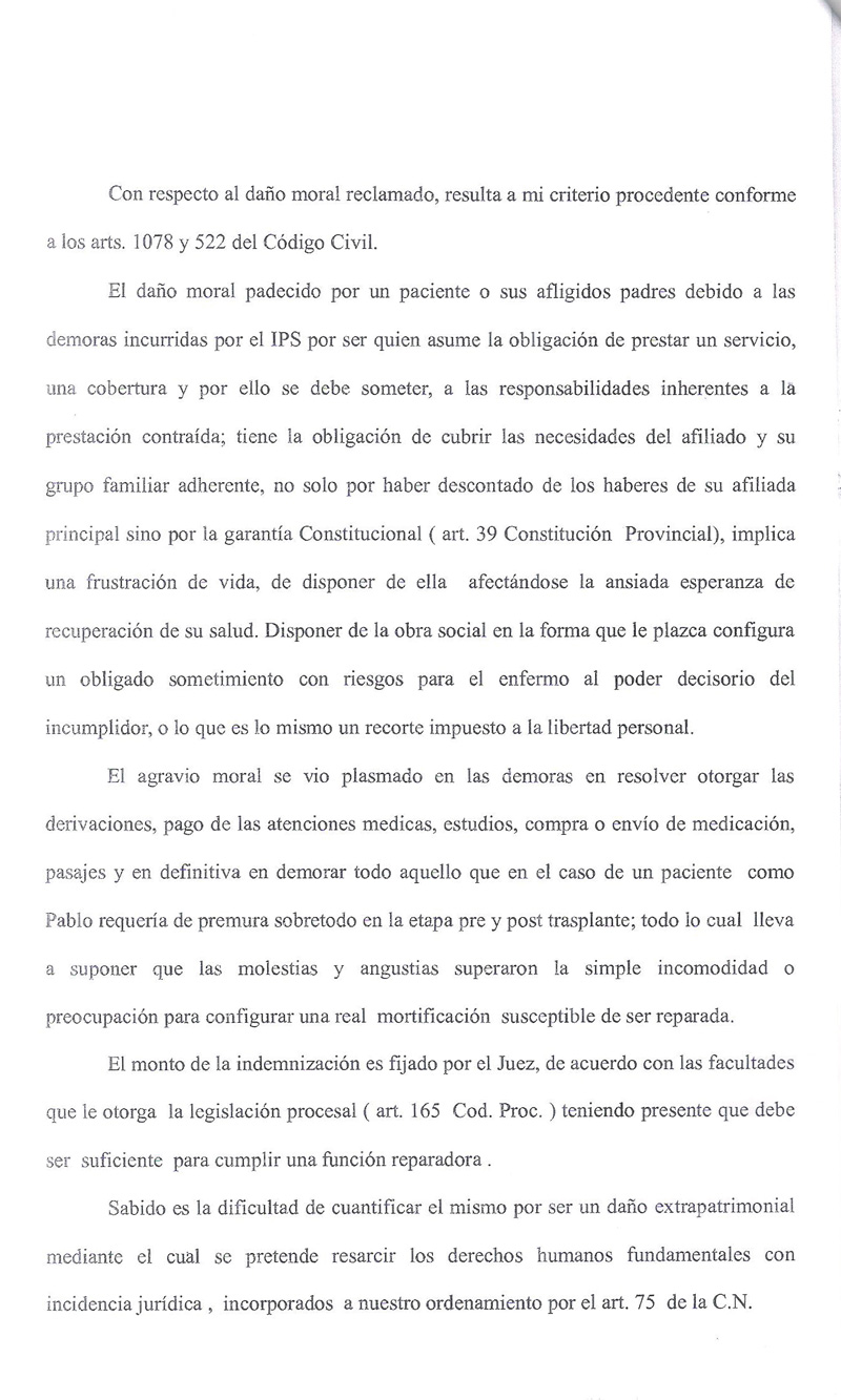 1) Haciendo lugar parcialmente a la demanda; condenando al Instituto de Previsión Social de la Provincia de Misiones a abonar a los actores en concepto de indemnización por daño moral al Joven Pablo Hernán Rodriguez ysus progenitores Miguel Angel Rodriguez y Blanca Argolo de Rodriguez …